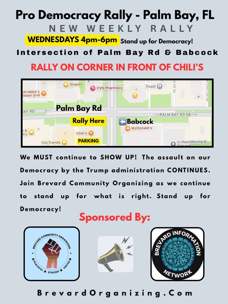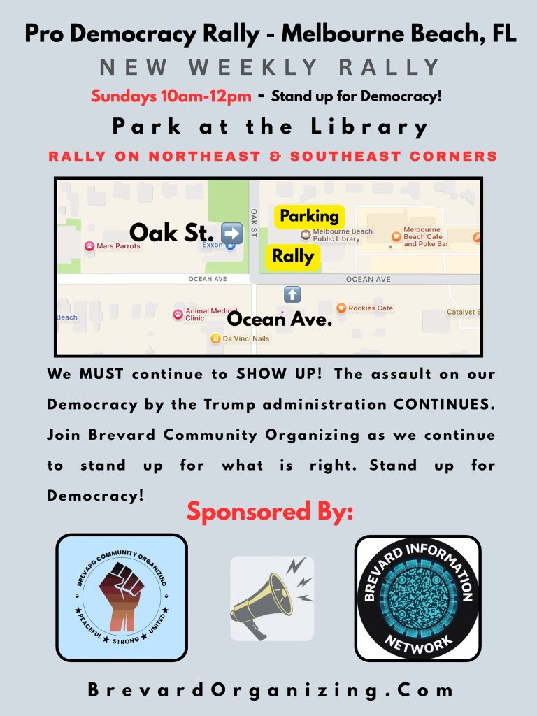 Cocoa Beach, FL – [Friday May 23, 2025] – Brevard Community Organizing is proud to announce a summer-long series of Pro-Democracy Rallies set to take place in Cocoa Beach on select Saturdays from 10 AM to 12 PM. The rallies will celebrate civic engagement and people power – We’re out here because we see a clear and present threat to democracy. This administration’s actions aren’t just politics as usual – they’re an attack on the very foundation of our rights; we are not staying silent. Let’s unite local voices in a peaceful, and empowering, show of solidarity.