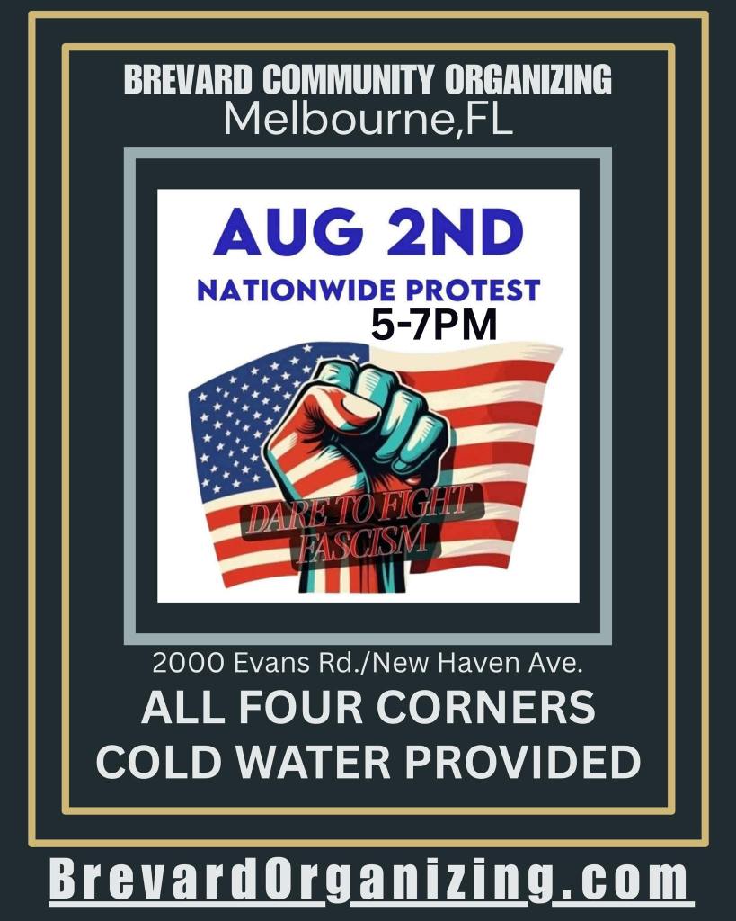 Brevard County, Fl – July 23 – Brevard Community Organizing will join communities across the country on Saturday, August 2nd, in a major nationwide protest to confront rising authoritarianism and demand accountability from elected leaders.